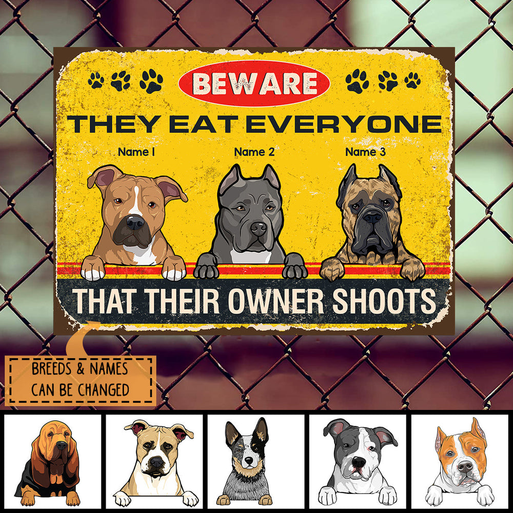 Beware They Eat Everyone That Their Owner Shoots, Yellow Warning Sign, Personalized Dog Breeds Metal Sign